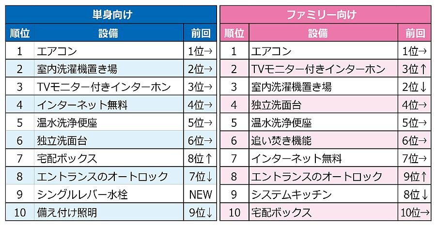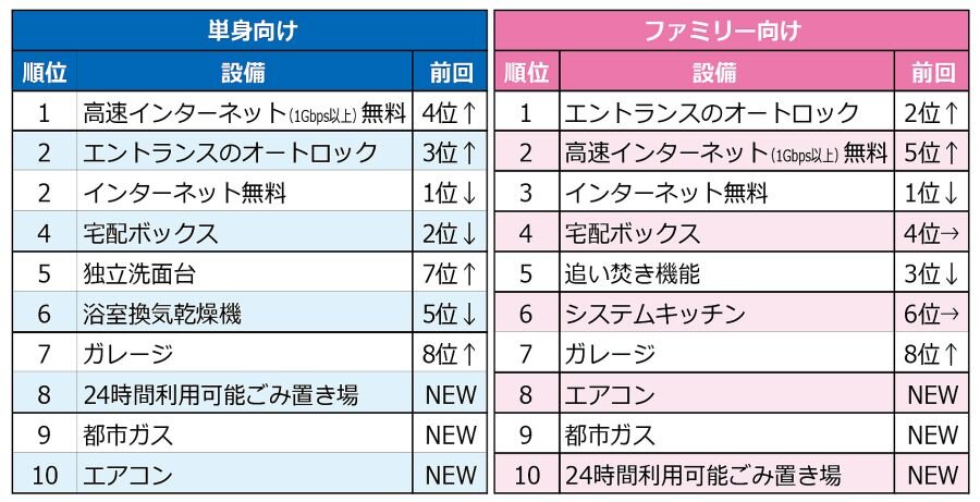 全国賃貸住宅新聞では、不動産会社にアンケートを実施し、人気設備のランキングを発表しています。